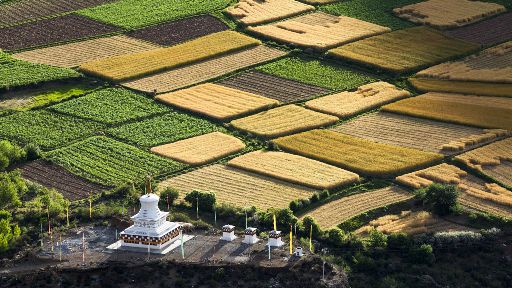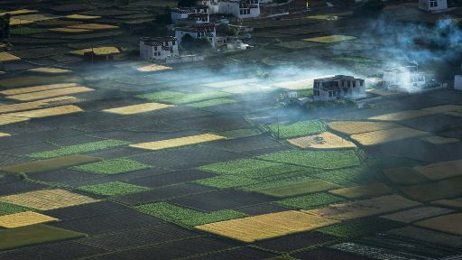 清晨,瓦藍(lán)瓦藍(lán)的天空云霧繚繞,周圍的景物一片朦朧,就好像童話里的仙境,一會(huì)兒,太陽(yáng)從東邊冉冉升起,霧也漸漸消失,村子里屋頂上飄著裊裊煨桑的煙子,我站在山岡上從高處向下俯望,只見高山峽谷之中,層層翠綠的梯田簇?fù)碇l(xiāng)城特有的白藏房,山下的田野,就像一片金色的海洋,將秀麗的田園裝扮得更加如詩(shī)如畫。一陣晨風(fēng)吹過,麥田上蕩起了一道道金色的波紋,遠(yuǎn)處傳來了畫眉鳥的歌聲,我被眼前的一切迷住了,仿佛一切都靜止了,她讓我的夢(mèng)從這里開始。