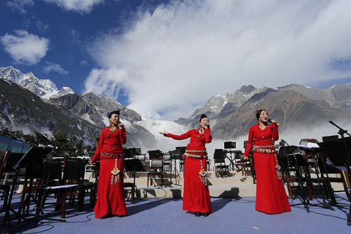 四號(hào)營(yíng)地,晴空萬(wàn)里、風(fēng)和日麗,清澈的高原天空藍(lán)得澄明醉人,來(lái)自四川交響樂團(tuán)和民間的200多位樂手共同在海拔3500米的冰川瀑布之下演奏了《青藏高原》、《向往神鷹》、《菊花臺(tái)》等歌曲。