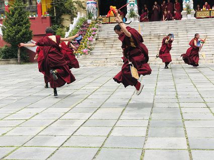 跳神儀式開始,南無寺內(nèi)鼓號齊鳴,喇嘛身著顯耀盛裝,點燃新綠松枝,幾縷藍色煙紋升起。一支由法鼓、鈸、海螺、法號等組成的寺廟樂隊自大殿而出,順時針繞場一周落座場邊,群神出場繞圈而舞,以示凈化場地,祈請諸神入位。接著,象征護法神舞、骷髏舞、鹿神舞、黑帽咒師舞和金剛力士舞的演員手持各類法器挨個入場手舞足蹈。舞蹈的起落根 據(jù)場邊奏響的器樂節(jié)奏進行。最后由眾神驅(qū)鬼逐邪,押送“朵馬”(由糌粑捏成用以供神施鬼的食品)至寺外拋丟焚燒,以示驅(qū)逐一年的邪魔,祈禱來年安樂。