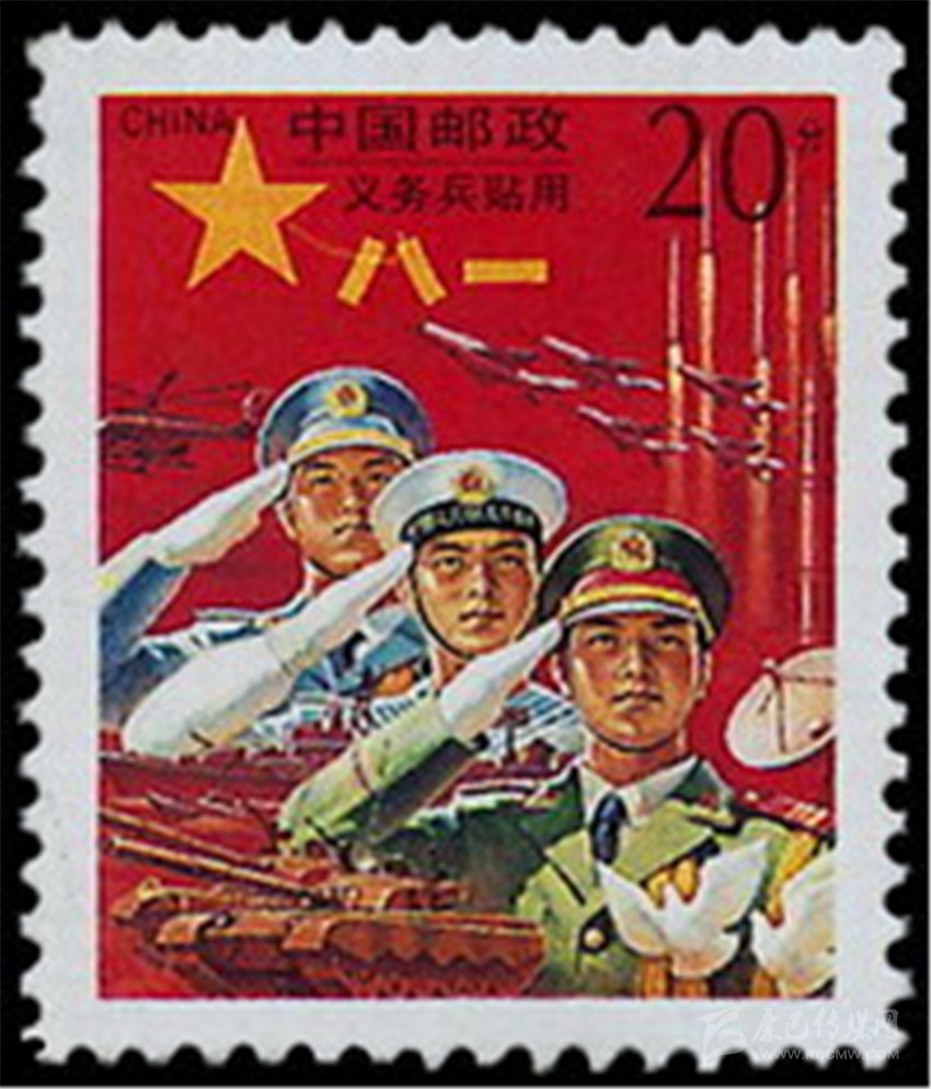 1995年8月1日,原郵電部試發(fā)行一套“義務(wù)兵專(zhuān)用”郵票一套1枚(圖5),票名為“神圣的使命”,圖案以紅光四射的“八一”軍旗為背景,以現(xiàn)代化的飛機(jī)、坦克、火箭和象征和平的白鴿為襯托,畫(huà)面是威武的陸??杖姡@示我軍鋼鐵長(zhǎng)城般功無(wú)不克、戰(zhàn)無(wú)不勝的精神風(fēng)貌。