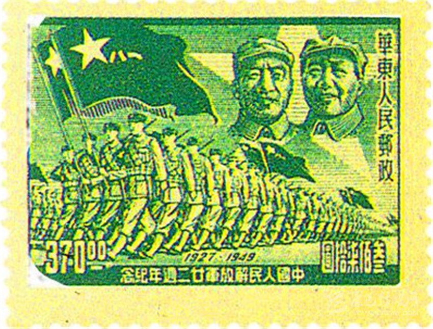 我國(guó)最早出現(xiàn)“八一軍旗”的郵票,是1949年8月1日, 剛解放的上海華東人民郵政發(fā)行的《中國(guó)人民解放軍建軍22周年》俗稱(chēng)《華東進(jìn)軍圖》郵票(圖1),一套5枚,同圖異色異值,郵票右上方為毛澤東主席和朱德總司令頭像,下方是鐵流般的人民軍隊(duì)高舉著一面面“八一軍旗”。 同年12月,西南區(qū)人民郵政又發(fā)行一套11枚圖案相同“西南進(jìn)軍圖”郵票(圖2)。