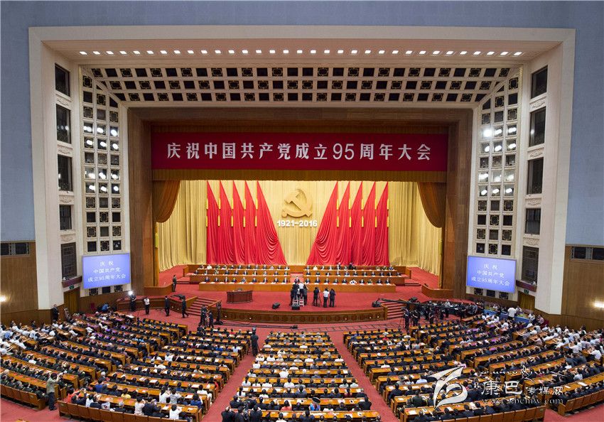 人民大會堂雄偉莊嚴(yán),萬人大禮堂燈火輝煌。主席臺上方懸掛著“慶祝中國共產(chǎn)黨成立95周年大會”會標(biāo)。帷幕正中,由鐮刀和錘頭組成的中國共產(chǎn)黨黨徽在十面紅旗映襯下熠熠生輝,“1921-2016”字樣格外醒目。大禮堂二層眺臺懸掛橫幅:緊密團(tuán)結(jié)在以習(xí)近平同志為總書記的黨中央周圍,銳意進(jìn)取、開拓創(chuàng)新,全面推進(jìn)黨的建設(shè)新的偉大工程,為實現(xiàn)“兩個一百年”奮斗目標(biāo)、實現(xiàn)中華民族偉大復(fù)興的中國夢而努力奮斗!