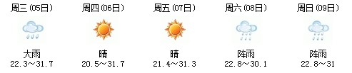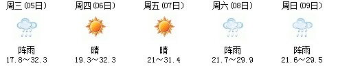 5日白天開(kāi)始一直到9日,以多云天氣為主,其中7日晚有陣雨,日最高氣溫在30度上下,天氣比較舒適,不會(huì)出現(xiàn)高溫天氣,高考和端午節(jié)期間天氣還是比較給力:
