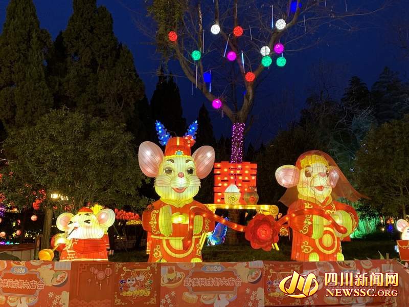 據(jù)成都武侯祠博物館工作人員介紹,“2020武侯祠成都大廟會”對燈組景觀和光影效果進行了全面升級,正門燈組主架構以漢闕風格和傳統(tǒng)吉祥圖案為基本元素,中為成都傳統(tǒng)民俗IP喜神主題的諸葛亮形象,兩側為兩只活潑可愛的生肖鼠,為游客送上“吉祥如意”和“鼠年大吉”的祝福。西區(qū)廣場和軸線兩大燈組分別以“喜神送寶”和“魅力天府”為主題,將生肖鼠和紅包、祥云、銀杏等吉祥元素相結合,營造溫馨、浪漫和喜慶的節(jié)日氛圍,呈現(xiàn)出吉慶祥和、物豐民富、前程似錦的魅力天府景象。西區(qū)湖面“三顧草廬”大型燈組長寬均達50米,高度超過20米,為歷屆廟會之最,形象上以大型彩燈描繪歷史故事,展示武侯祠作為“三國圣地”的厚重歷史底蘊,配合蓮花、仙鶴、祥云、福樹等點綴和流水追光,將宏大敘事和細節(jié)裝飾完美融合。