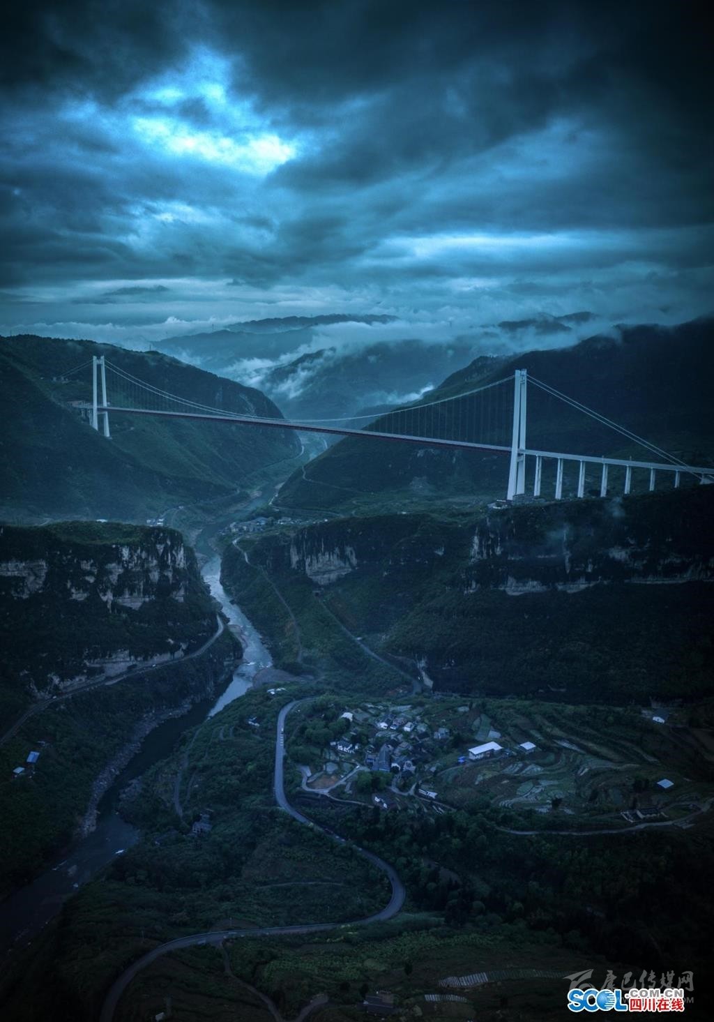 4月11日,雨后的瀘州市古藺縣的赤水河紅軍大橋在云霧中,大橋橫跨赤水河兩岸,連接川黔兩地,在連綿的烏蒙山中更加壯觀。赤水河大橋主橋跨徑1200米,為雙塔單跨鋼桁梁懸索橋,索塔采用門形框架鋼筋混凝土結(jié)構(gòu),貴州岸塔高243.5米,是世界山區(qū)峽谷同類型橋梁中第一高塔,同時也是國內(nèi)山區(qū)峽谷同類型橋梁第二跨度的鋼桁梁懸索橋。作為四川南向出川大通道,增強了川南、黔北、渝西等地的經(jīng)濟聯(lián)系。