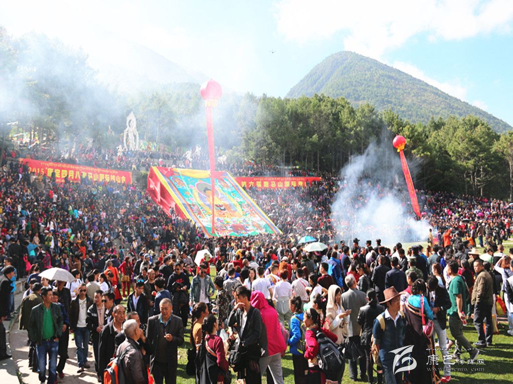 康定“四月八”跑馬山轉(zhuǎn)山會(huì),是自藏傳佛教入康定起就有的活動(dòng),至今已有千年歷史。相傳農(nóng)歷四月初八是佛祖釋迦牟尼的誕辰日,這天跑馬山頂?shù)奈迳V杏芯艞l龍吐水為佛祖沐浴,故稱浴佛節(jié)。人們?yōu)榧o(jì)念這一吉祥日子,每逢農(nóng)歷四月初八,便從四面八方不約而同云集康定跑馬山上,載歌載舞,預(yù)祝豐收,場面壯觀,熱鬧非凡。據(jù)初步統(tǒng)計(jì),在今年四月八當(dāng)天,共有近四萬名各族群眾、游客齊聚跑馬山歡度傳統(tǒng)佳節(jié)。