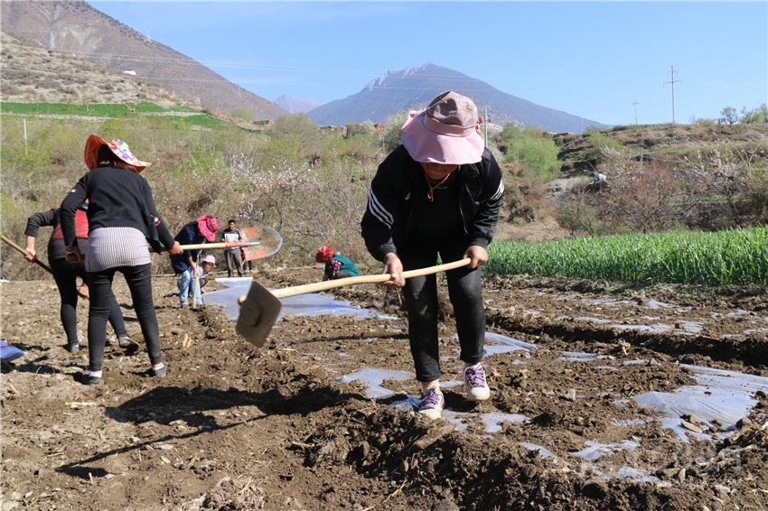 4月15日,記者從巴塘縣城出發(fā),沿國(guó)道318線(xiàn)走訪(fǎng)了該縣的5個(gè)村莊,沿途看到絕大多數(shù)耕地都鋪上了地膜,記者在該縣黨巴鄉(xiāng)玉卡通村看到正在忙碌播種玉米的村民。而這支春耕隊(duì)伍的“帶頭人”正是該村村民大尼瑪,在場(chǎng)的人都是其家人或鄰居。