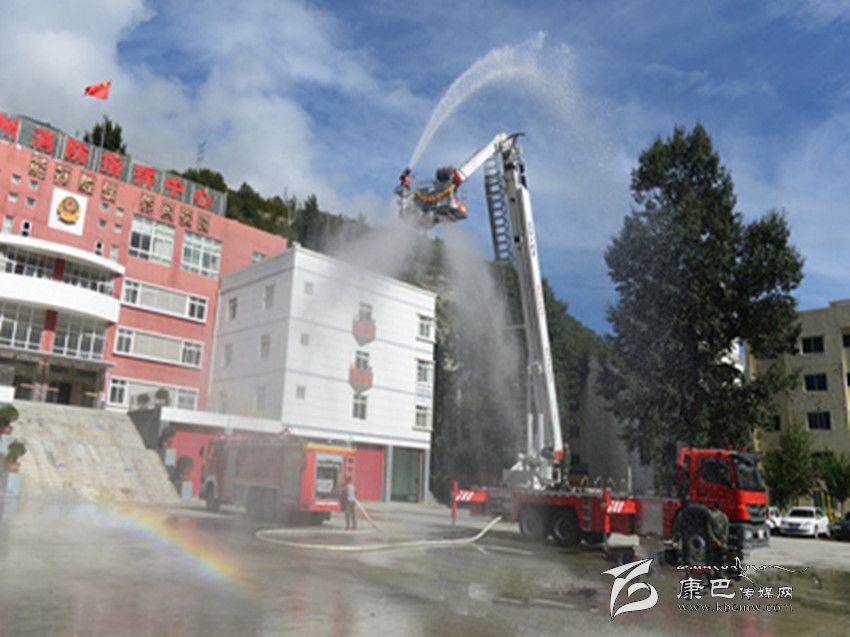 本網(wǎng)訊(劉國謙文/圖)9月8日上午,甘孜消防支隊(duì)操場衛(wèi)聳立著一道“銀色天梯”,筆者在現(xiàn)場目擊了 DG-32C登高平臺(tái)消防車的變形過程。隨著 4個(gè)支撐架的展開,車體被架離地面,登高平臺(tái)臂緩緩上升,如“擎天柱”般伸向云端。在兩名駕駛員的配合操作下,平臺(tái)頂端配載的水炮噴射出一條長長的水龍,隨著水壓漸漸加大,奔騰的水龍帶著一道彩虹劃過高空,成為云端深處一道壯觀的麗景。