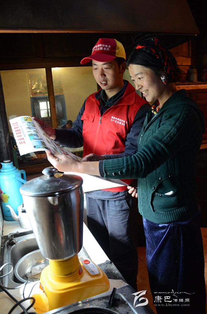 告別學(xué)校的同學(xué)們,新都橋供電所的工作人員又趕向下一個地點(diǎn)——瓦澤鄉(xiāng)營官村。走進(jìn)一戶農(nóng)民的家里,女主人汪修卓瑪正在用打茶機(jī)制作酥油茶,打茶機(jī)旁的電爐上一個水壺正在咕嚕咕嚕地冒著熱氣。工作人員趕緊走上去關(guān)掉電爐,并告訴汪修卓瑪:“你們平時(shí)使用電爐等家用電器要注意安全,水特別容易導(dǎo)電,水開了要及時(shí)關(guān)掉電爐,使用打茶機(jī)時(shí)要先擦干外殼和底部的水……”