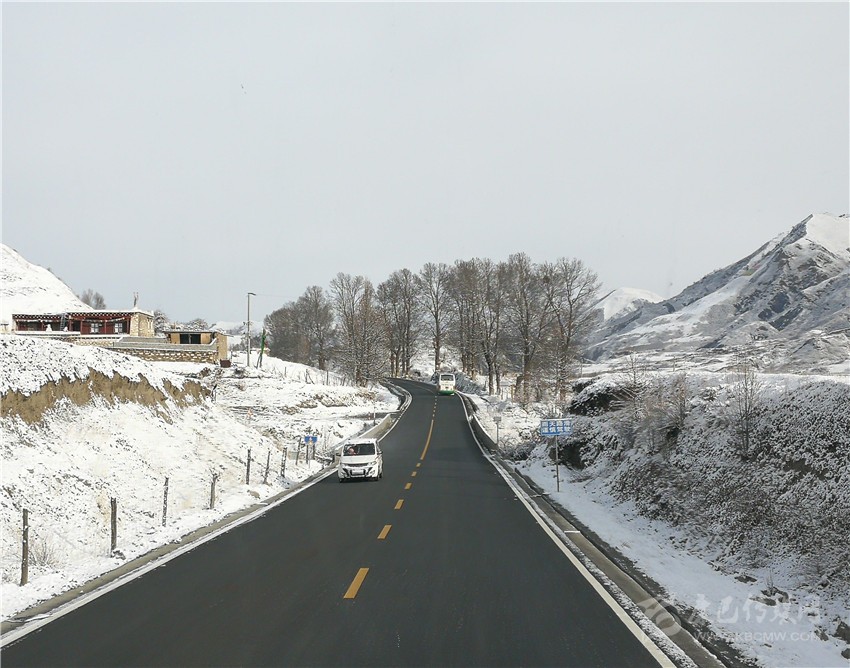 安全通過(guò)折多山后,天已完全放亮,只見(jiàn)道路兩邊的山丘、草地和樹(shù)木全被積雪覆蓋,與之形成鮮明對(duì)比的是一條寬闊平整的黑色柏油路,整個(gè)畫(huà)面就像一幅水墨畫(huà),而我們這車人就行進(jìn)在“畫(huà)中”。