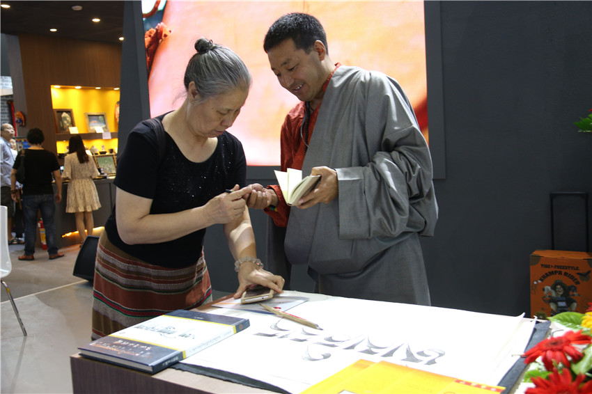 而在同一地點的另一側(cè),省級藏文書法傳承人巴松鄧珠的藏文書法也吸引著眾多愛好書法市民前來觀賞,還有的與他合影?!爸笇?dǎo)過我的書法家非常多,他們不僅給了我許多寶貴的意見,更重要的是給了我信心和動力,讓我堅持寫書法,并成為康體藏文書法的傳承人。”巴松鄧珠說,這次能夠得到州委、州政府搭建的平臺,我會珍惜好這次難得的機遇,把作品展示好、宣傳好,讓全國各地的人們更多地了解我州民族文化。