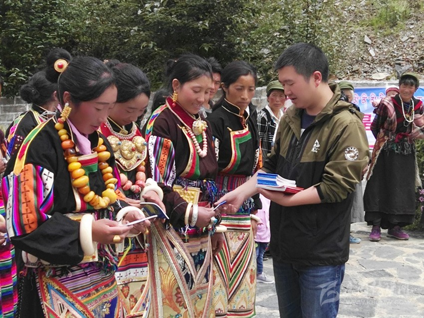 稻城亞丁景區(qū)管理局工作人員向拉木格村村民發(fā)放民族團(tuán)結(jié)宣傳資料。