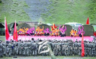 慰問演出在獨(dú)立營(yíng)戰(zhàn)士的拉歌聲中徐徐拉開帷幕,隨后,《北京的金山上》、《我的士兵兄弟》等一首首耳熟能詳?shù)母枨鹨簧涎?。《歡歌踏舞》、《盛世歡歌》等舞蹈,時(shí)而歡快跳躍,時(shí)而雄壯豪邁,歌曲《說句心里話》唱出了官兵的思念之情,也唱出了官兵們保家衛(wèi)國(guó)的心聲。整場(chǎng)演出在舞蹈《康巴人》中落下帷幕。