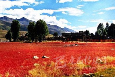 “紅草地”的后面是一個小村莊,村莊的周圍也有一些白楊樹,在秋風(fēng)的熏陶下大都已變成金燦燦的黃色?!凹t草地”的四周被幾座大山所環(huán)抱。晚秋中,五顏六色的大片色塊亮麗張揚(yáng)地組合在一起,水天同彩地纏綿出一幅斑斕、夸張、濃墨重彩的油畫山水。在黃綠相間的楊樹和藍(lán)天白云的映襯下,紅得特別的燦爛。一片只有足球場大的紅草地,每年只有十多天的風(fēng)光,是成了稻城一個標(biāo)志性景點(diǎn)。